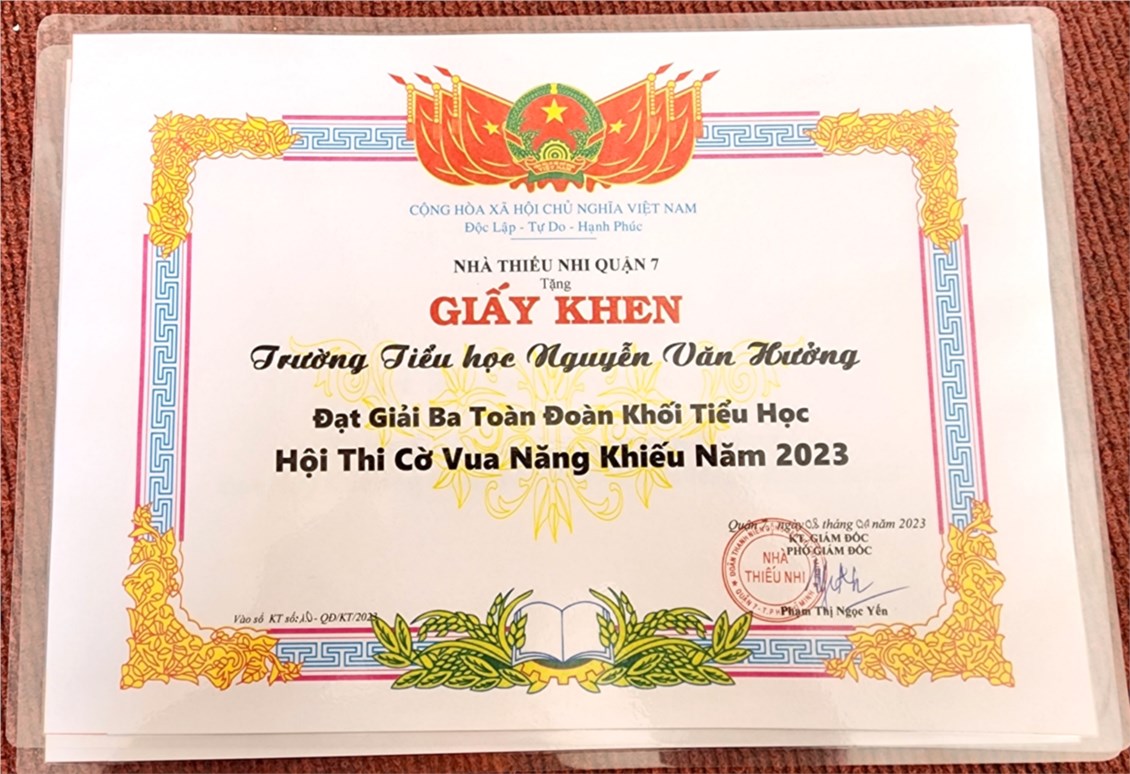 Thứ 7 ngày 08 tháng 04 năm 2023, các em học sinh trong đội tuyển cờ vua đại diện trường Tiểu học Nguyễn Văn Hưởng tham gia hội thi cờ vua năng khiếu năm 2023. Chúc mừng các em đã hoàn thành tốt nội dung thi và mang về cho trường những giải thưởng xuất sắc.